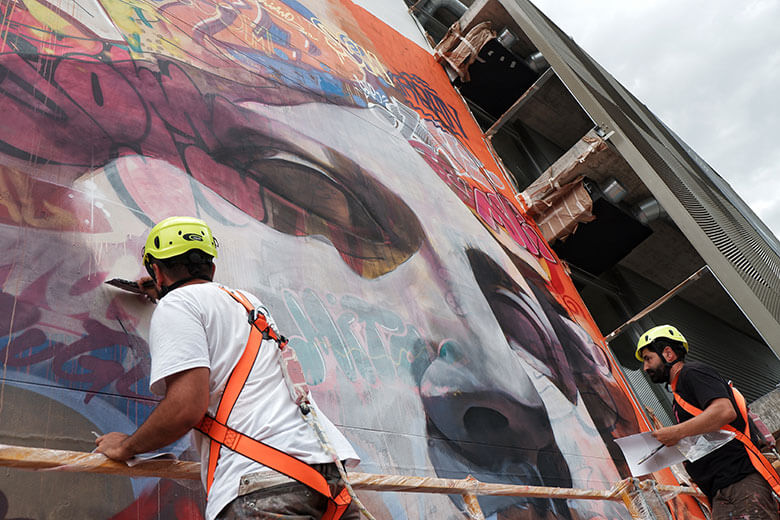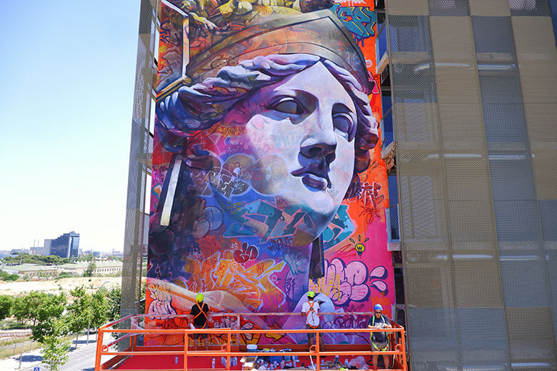 En el mural, comisariado por Rebobinart, los artistas han versionado la escultura de Palas Atenea situada en el Parlamento Austríaco en Vienna. En el mural, la diosa observa desde sus 25m de altura cómo se mueve a sus pies la ciudad, mientras da cobijo y la cara a una residencia de estudiantes.